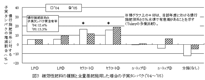 | [要約] | パン用小麦品種「ニシノカオリ」において、「25~30日タイプ」の被覆尿素50%配合の複合肥料を慣行施肥体系(開花期追肥施用)と窒素同量、基肥施用することにより、収量、子実タンパク質含有率は慣行と同程度となり、追肥が省略できる。 |