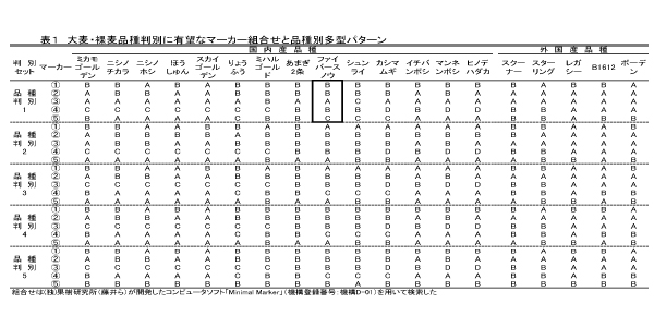 | [要約] | 国内で流通する国内外の主要な大麦・裸麦19品種について、242組のSSRマーカーのうち61組で利用可能な多型のカタログが得られ、5マーカーの組合せで全品種が判別可能な最少マーカー119セットが検出できる。 |