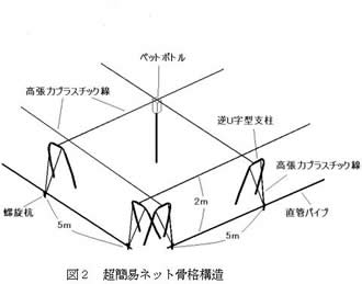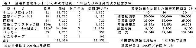 | [要約] | 露地キク栽培で4mm目合いネット被覆によるタバコガ類防除において、逆U字型支柱パイプ間に高張力プラスチック線を展張し、さらに1本脚支柱でネットの下垂を防止する方法は、設置が極めて容易で、14万円/5a程度で設置できる。 |