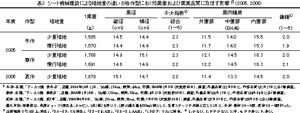 | [キーワード] | メロン、根域制限栽培、防根透水シート、埋設機、機械化、省力化、連作障害 |