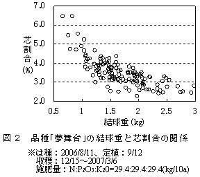| [要約] | 加工用キャベツの冬どりに適する品種として、芯の結球重に対する重量割合が小さく、芯の長さが短い「夢舞台」と「彩音」を選定した。これら品種の芯の重量割合は、結球重約2kg以上で概ね3%以下となる。 |