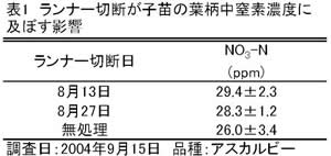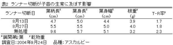 | [成果情報名] | イチゴ「アスカルビー」のベンチ無仮植育苗におけるランナー切断による苗質向上 |