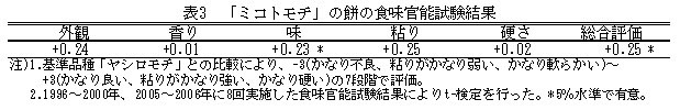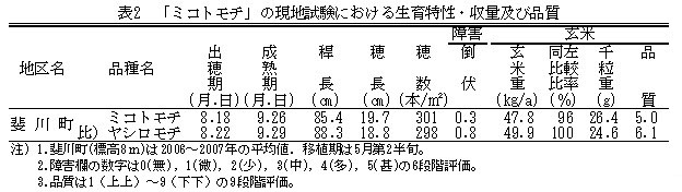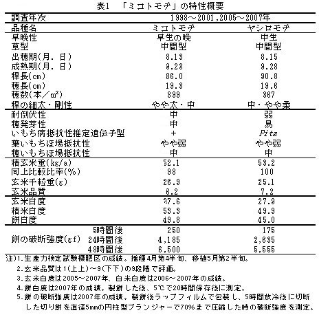 | [成果情報名] | 早生で餅質の良い水稲糯品種「ミコトモチ」 |