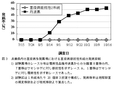7.丹波黒を反復親とする戻し交配集団から上記2種類のマーカーにより選抜した2個体の後代系統を茎疫病菌レースAが高率に分布する圃場で栽培すると強い抵抗性を示す(図3)。