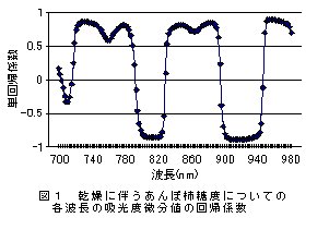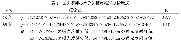 1.(株)クボタ製、携帯型分光光度計フルーツセレクター(K-BA100型)を用いることで、西条柿あんぽ柿の水分ならびに糖度の、非破壊測定による検量式を得ることができる(表1、図1)。