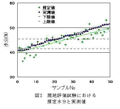 2.上記の水分検量式を用いて、現地加工施設における評価試験を行うと、乾燥終了目安である範囲内(42~45%)の判定ミスは全体の18%となり、乾燥終了判定の参考として利用可能である(図2)。