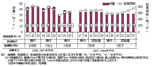 1.晩播の収量は、6月中旬、7月上旬の適期播種と比べて稔実莢数が減少するため、低下する。栽植密度を高めることで、稔実莢数が増加し、収量の低下は抑えられるものの、15~20本/㎡確保すれば、それ以上高めても収量は増加しない(図1)。