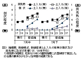 4.莢先熟は、倒伏と同様に密条播で密植ほど発生が多い(図3)