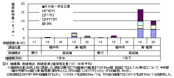 5.雑草の発生量は、密条播ではダイズ群落による地表面の被覆が早いことから(データ省略)、畦中央部では慣行並に少ない。溝・畦肩部分では雑草の発生量は多いが、栽植密度が高いほど雑草の発生を抑制する(図4)
