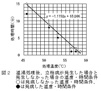 4.立枯病が発生しない温湯処理温度と時間の関係は、45.7℃~59.6℃の温度範囲では、時間(分)=-1.1158×温度(℃)+65.806で表される(図2)。この式より、50℃10分、46.4℃14分などの条件で温湯処理することにより立枯病の防除が可能と考えられる。