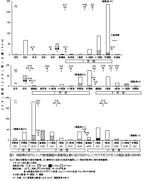 1.土壌中のコナダニ密度は5月下旬以降低下するが、それ以前は栽培管理に応じて変化する(図1)。冬期休作圃場では、ビニル被覆直前にはコナダニ密度は低いが、ビニル被覆後、ホウレンソウの生育に伴い4月下旬以降高まる(図1-A、B)。一方、周年栽培圃場では、3月でもコナダニ密度が高く推移する(図1-C)。