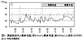 2.5月下旬以降は、コナダニに対して無防除でも、全ての層の土壌におけるコナダニ密度が低下し、ホウレンソウの被害も殆どない(図1-C)。同時期の深さ5cmの施設内土壌における最高地温は25℃以上、最高気温は30℃以上の日が多い(図2)。深さ0~5cmの最高地温は深さ5cmの最高地温以上と推測され、この地温上昇が密度低下の原因と考えられる。
