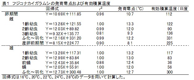 1.フジコナの発育零点と有効積算温度は、卵では10.7℃、112日度、雌のふ化から羽化までは12.2℃、331日度である(表1)。