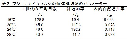 2.フジコナの内的自然増加率は24℃で0.117と最も高くなり(表2)、30日後には約27倍の個体となる潜在的繁殖能力を示す。
