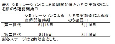 3.これらを使用しJPP-NET(日本植物防疫協会提供)の有効積算温度シミュレーションで2006年出雲市の気象データを用いてフジコナの発生予測を行うと、第一世代、第二世代の卵のう発生時期はそれぞれ6月16日、8月5日と予測される。現地カキほ場における発生調査では6月16日、8月16日に卵のうが確認され予測値とほぼ一致する(表3)。また、2007年においても同様の結果が得られている。