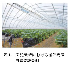 1.紫外光照明装置は亜鉛鋼板本体にアルミ反射板がついており、これに20形専用光源付防水リングがついている。この光源を10a当たり30台、イチゴから約2mの高さで5m間隔に設置する。午前9時から午後3時までの6時間、毎日照射する。図1は高設栽培ハウスでの設置事例。