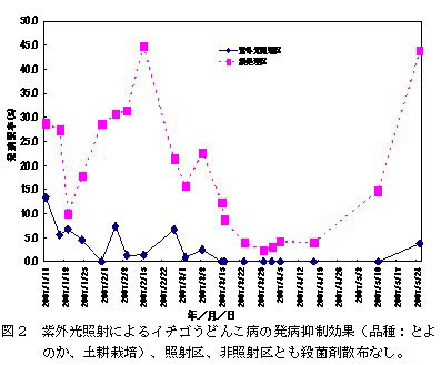 2.1.の装置の試作品を設置したビニルハウスにおいて、うどんこ病発病前(ここでは11月1日に照射、無処理での発病は11月17日)から紫外光を土耕栽培イチゴ「とよのか」に継続して照射すると、果実のうどんこ病を強く抑制し、その効果は1月から5月の長期間にわたり継続する(図2)。また、葉においても同様のうどんこ病抑制効果が認められる。