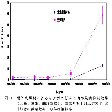 3.高設栽培の「章姫」においてもうどんこ病発病前から照射を開始すると高い発病抑制効果を示す(図3)。