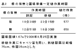 2.圃場準備や定植時の機械稼働時間は、柵設置圃場に比べて柵無設置圃場で明らかに少ない。また、栽植株数は、柵設置圃場に比べて柵無設置圃場で多い(表2)。よって、定植後に柵を設置することで、圃場準備や定植時の作業性が向上し、栽植株数も確保できる。
