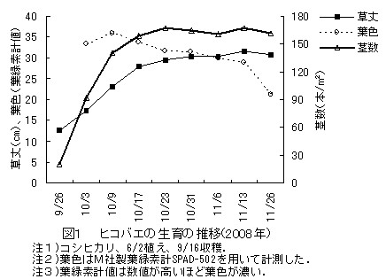 1.ヒコバエの生育の推移は、コシヒカリの9月中旬収穫では、9月下旬に分げつを始め、10月上旬から旺盛となり、10月下旬には分げつ終期となってほとんどの株で出穂する(図1)。