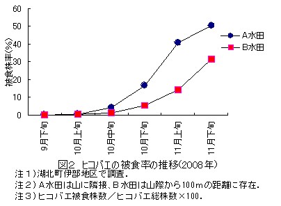 2.ヒコバエのシカによる採食の推移は、コシヒカリの9月中旬収穫の場合、9月下旬での食痕はなく、10月上旬から採食が始まり、10月下旬には急激に増加して11月にピークとなる(図2)。また、12月に入ると新たな食痕は認められない(データ略)。