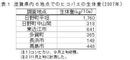3.県内6か所でのヒコバエ生体重は、コシヒカリの9月上旬収穫の場合、0.2~2t/10aである(表1)。