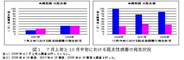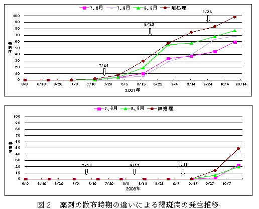 2.TPN水和剤を7月中~下旬と8月中~下旬に2回散布すると、多発条件下および少発条件下ともに10月中旬の褐斑病の発生が軽減され、秋期の褐斑病の増加を抑制することができる。(図2)。