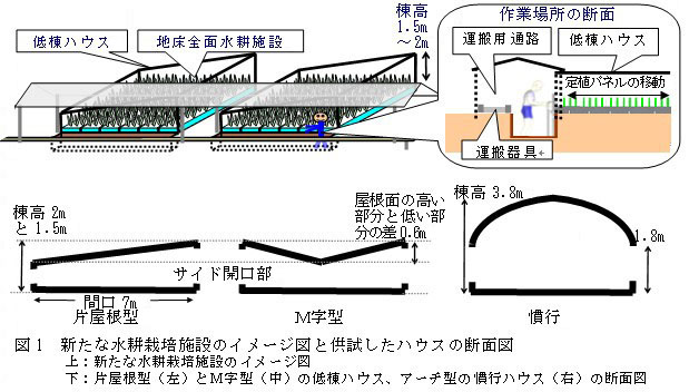 現状の慣行アーチ型ハウスと高設栽培ベッドを用いたネギの水耕栽培施設は、施設費が高い。そこで、これまでに開発した水耕ネギの定植・収穫作業を栽培ベッドの片端のみで行える軽労化システム(平成19年度近畿中国四国農業研究成果情報)を活かし、ハウス棟高を大幅に低くすることによる施設費の削減と、通路をなくした施設内全面栽培ベッドによる増収を目指した新たな水耕栽培施設と作業システムを開発中である(図1上)。本研究では、低棟ハウスの形状と棟高が、盛夏季のハウス内気温とネギの生育に及ぼす影響について明らかにする。