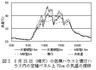1.盛夏季のハウス内気温(栽培ベッドの定植パネル上70cm)は、慣行に比べて、低棟ハウスの片屋根型2mとM字型2m(図1下)が低く推移する(図2)。M字型1.5mは同等、片屋根型1.5mは高く推移する。