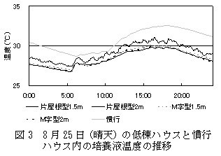 2.培養液温度は、慣行に比べて、低棟ハウスのいずれも低く推移する(図3)。低棟ハウスの中では、片屋根型2mとM字型2m、M字型1.5mが片屋根型1.5mよりも低く推移する。