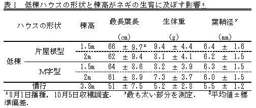 | [成果情報名] | 全面水耕栽培での低棟ハウスの形状と棟高がハウス内気温とネギの生育に及ぼす影響 |