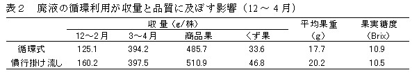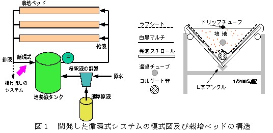 平成10年より研究してきた徳島農研方式イチゴ高設栽培システムは、ベッド底面に配したコルゲート管により排液を集水でき、容易に循環式へ改良できる。そこで、低コストな循環式システムを開発するとともに、収量・品質に与える影響について検討する。