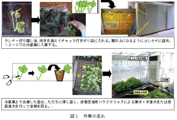そこで、採苗したランナー子株の貯蔵技術及び貯蔵終了後のセル成型育苗における活着促進技術を開発することにより、小さなスペースでの大量生産が可能な苗生産システムを確立し、採苗・仮植作業の分散及び自由度の拡大に資する。