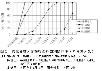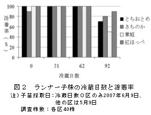 3.約2か月間は、葉やランナーの褐変、挿し苗後活着率低下などの障害が少なく貯蔵可能である。ただし、品種間で程度の差はあるが、貯蔵期間が長くなるほど開花期の遅れが顕著になるため、定植用苗を育成する場合冷蔵は1か月までとする(図2、図3)。