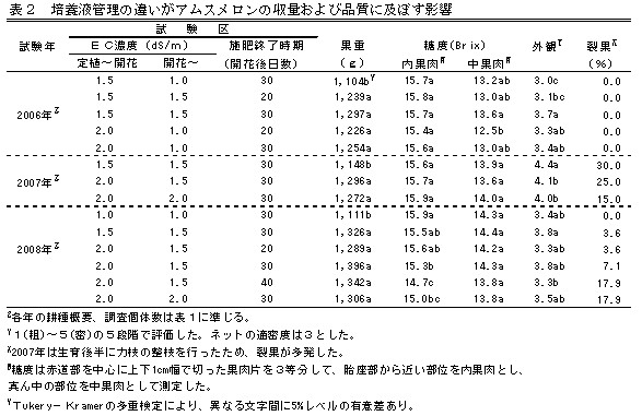 1.アムスメロンを少量土壌培地耕で無加温半促成栽培する場合、培養液は山崎処方メロン用培養液を用い、定植から開花までの期間をEC2.0dS/m、開花後30日間をEC1.5dS/mで給液し、それ以降は水のみで管理すると、販売規格の上位等級とされる果重1200~1300g、内果肉糖度(Brix)15以上の果実が収穫できる(表2)。