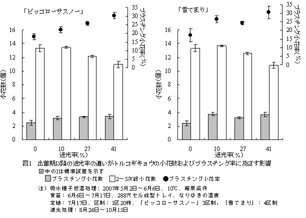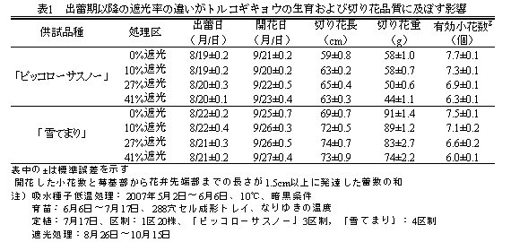 | [成果情報名] | 八重咲きトルコギキョウの出蕾期以降の遮光はブラスチング小花率を高くする |