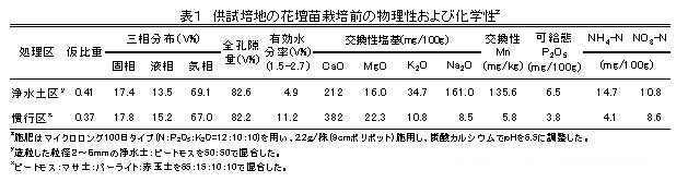 2.有効水分率は、浄水土区(浄水土混合培地)で慣行区と比べて低いが、仮比重、三相分布および全孔隙量は慣行区とほとんど差がない(表1)。NH4-Nは浄水土区が慣行区より多い。また、浄水土区の交換性Na2Oおよび交換性Mn含有量は、慣行区と比べて著しく多い。
