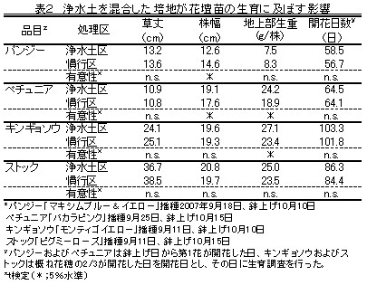 1.浄水土にピートモスを加え容積比で50%利用しても、ペチュニア、パンジーおよびキンギョソウには利用できるが、ストックには利用できない。