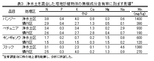 4.植物体の無機成分含有率は、すべての品目で浄水土区のNが高く、逆にCaが低い。Kはパンジーおよびペチュニアでは浄水土区が高く、一方、キンギョソウおよびストックでは低い。他の無機成分含有率では、Naは浄水土区で慣行区の4.0~6.0倍、Mnは3.6~5.1倍と高い特徴がみられる(表3)。