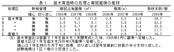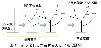 1.クリ「岸根」の1年生苗木を、苗圃でさらに1年間育成した苗木を定植することにより、樹冠占有面積が大きく、樹高も高くなる。苗木の育成方法は、5月下旬頃新梢を摘心し、次年度の定植時に枝を半分切り返す方法が良い。この処理により、定植後の母枝数が多く確保できる(表1、図1)。