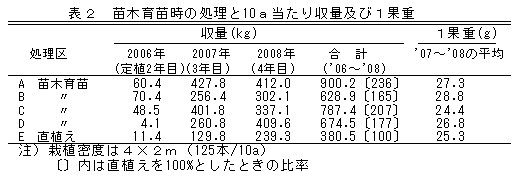 2.結実初期の収量は、1年間育成することにより多くなる。1の方法では本圃定植4年目までの10a当たり合計収量は約900kgとなり、定植3年目と4年目の収量は400kg以上を確保できる。1果重にはほとんど差はない(表2)。 また、病害虫発生率など正果率にも大きな差はない(データ省略)。