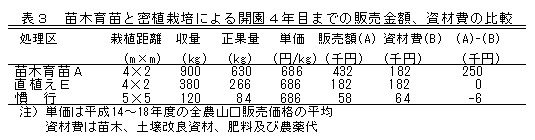 3.4×2mの計画密植栽培と1年間の苗木育成を組み合わせることにより、現在一般的に行われている慣行栽培法(栽植密度5×5m、1年生苗木の圃場定植)に比較して、定植から4年目までの初期収量は約7倍確保でき(データ省略)、販売金額から資材費を差し引いた金額は10a当たり約25万円多くなる(表3)。