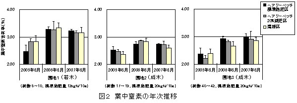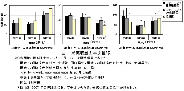 2.10年生以下の若木では、ヘアリーベッチ草生栽培の導入により、収量が減少する場合がある(図1)。