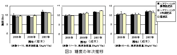 3.有機物をウンシュウミカン園に省力的に補給できるため、傾斜地園ではヘアリーベッチ草生栽培の導入が有効である。