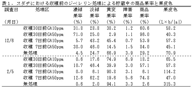 | [成果情報名] | スダチにおける収穫前のジベレリン処理による低温貯蔵中の果皮緑色保持技術 |