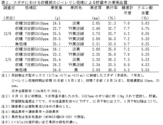 2.収穫前のジベレリン処理により果皮が厚くなることがある。また、糖度計示度及びクエン酸含量が低くなることがある(表2)。