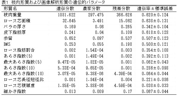 3.枝肉形質では0.342~0.683と大半で比較的高い遺伝率が、また、画像解析形質では0.038~0.392の遺伝率が推定され、特にロ-ス芯の脂肪割合や脂肪交雑粒子塊の大きさを示す「あらさ指数:細線化5回(以下(5))」などでは、0.35を超える中程度の遺伝率が推定される(表1)。