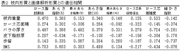 4.枝肉形質との遺伝相関を検討したところロース芯内のあらさや脂肪割合に正の相関が認められる一方、脂肪交雑粒子の細かさを示す「細かさ指数」と負の相関が認められる(表2)。