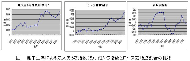 5.評価された雌牛の生年による「あらさ指数(5)」、「ロース脂肪割合」「細かさ指数」の育種価について推移を検討したところ前2者が上昇しており、近年、脂肪交雑粒子塊の大きなものが増加している傾向が示唆される(図1)。
