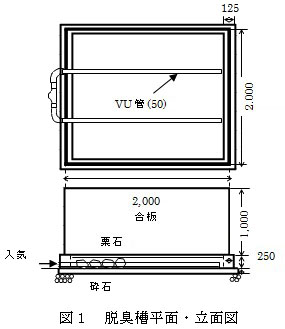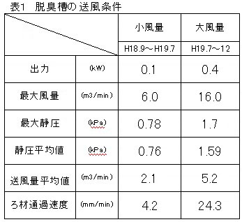2.脱臭槽の容積は約4m3、その中に広葉樹チップ(平均体積6.2cm3,平均表面積11.7cm2,総重量1.8t)を投入し、その上に硝化槽から採取した汚泥を70L上部から散布した。